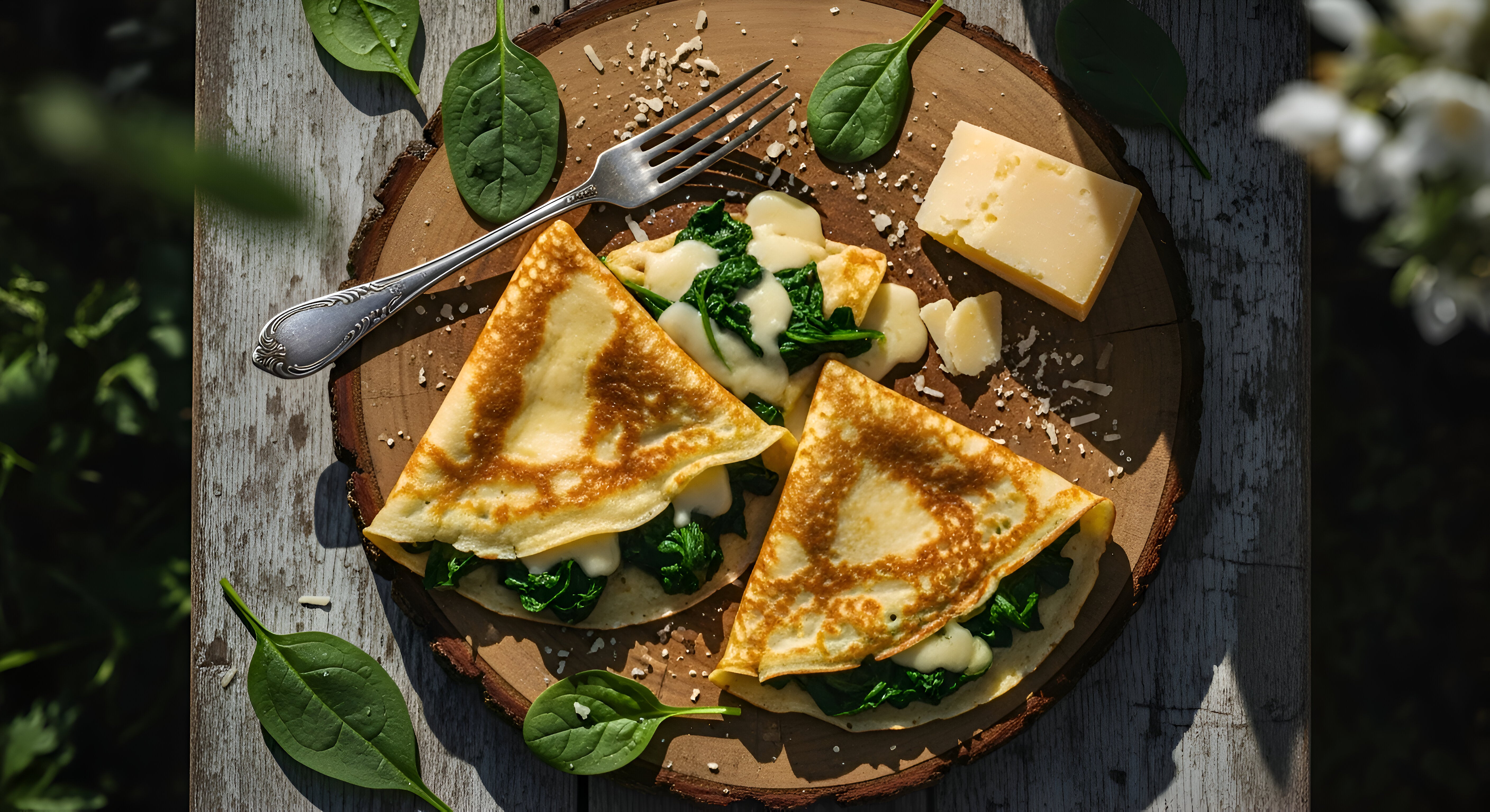 Ajouter les épinards sur une moitié de la crêpe (60 g pour une grande crêpe ou 30 g pour une moyenne) et refermer pour obtenir un demi-cercle.