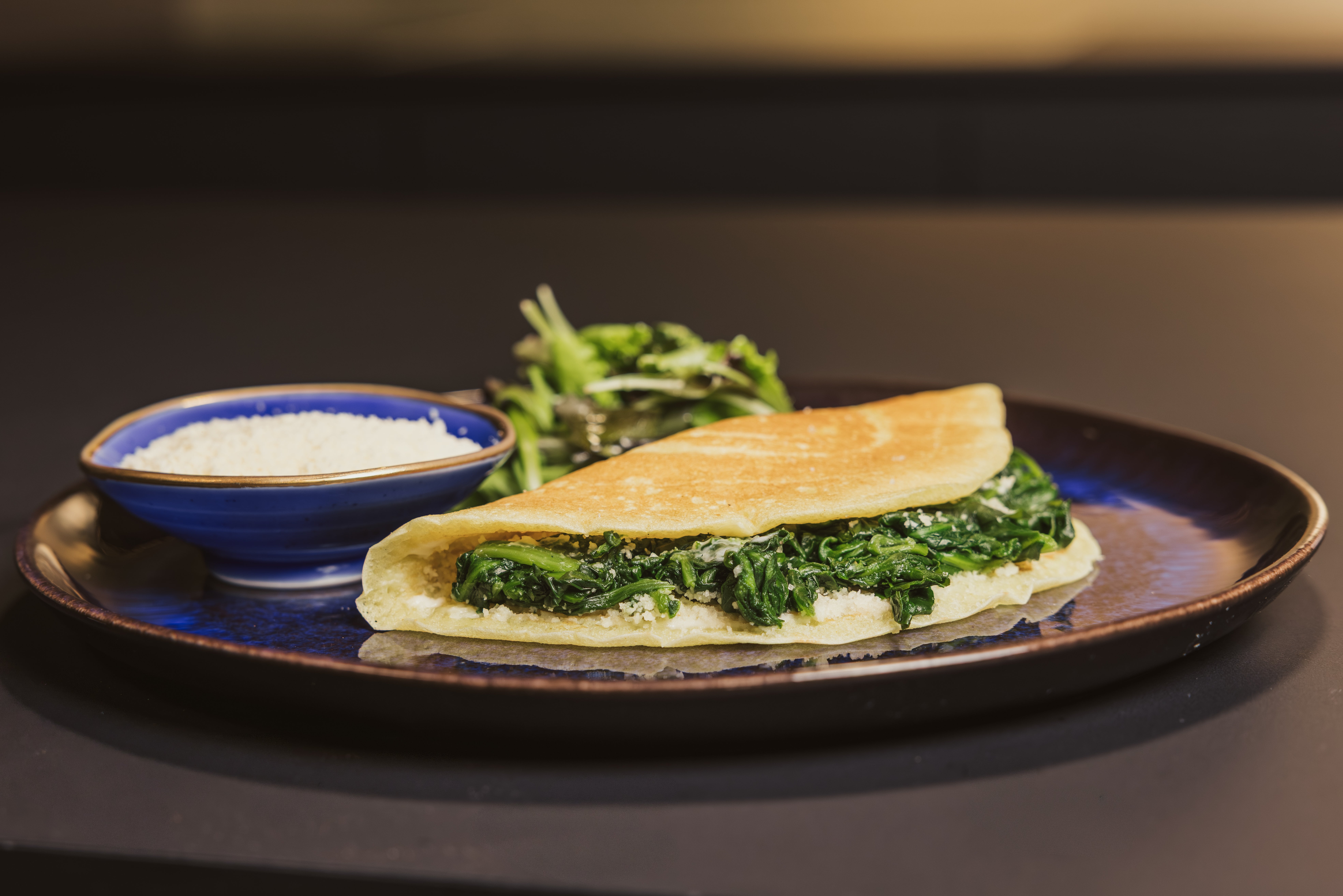 Déposer la crêpe dans une assiette et accompagner de salade. Assaisonner la salade d’un filet d’huile d’olive, de sel et de poivre.